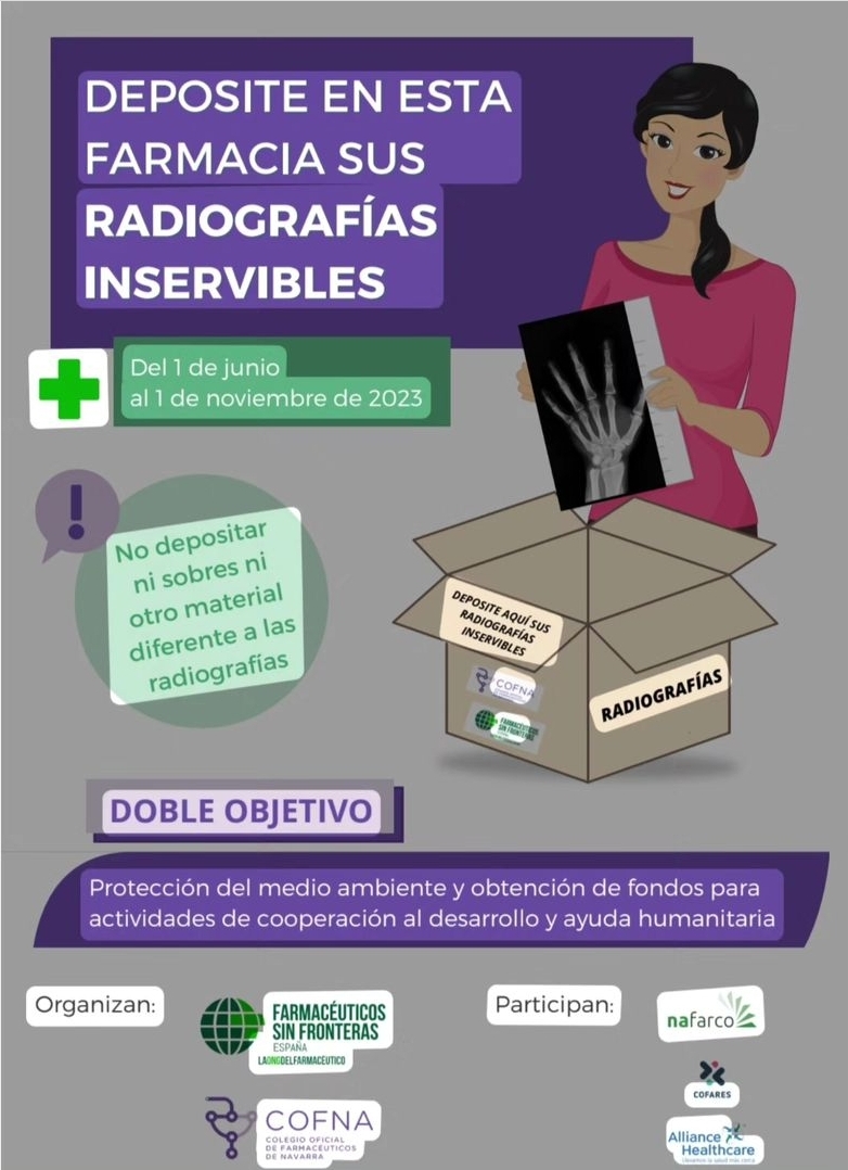 Desde COFNA Impulsamos una nueva edición de la campaña de Recogida de Radiografias junto a Farmacéuticos Sin Fronteras y en colaboración con Nafarco, Cofares y Alliance Healthcare. Hasta el 1 de noviembre, puedes acercarte a tu farmacia a entregar tus radiografías inservibles. El objetivo es doble: por un lado ecológico, porque